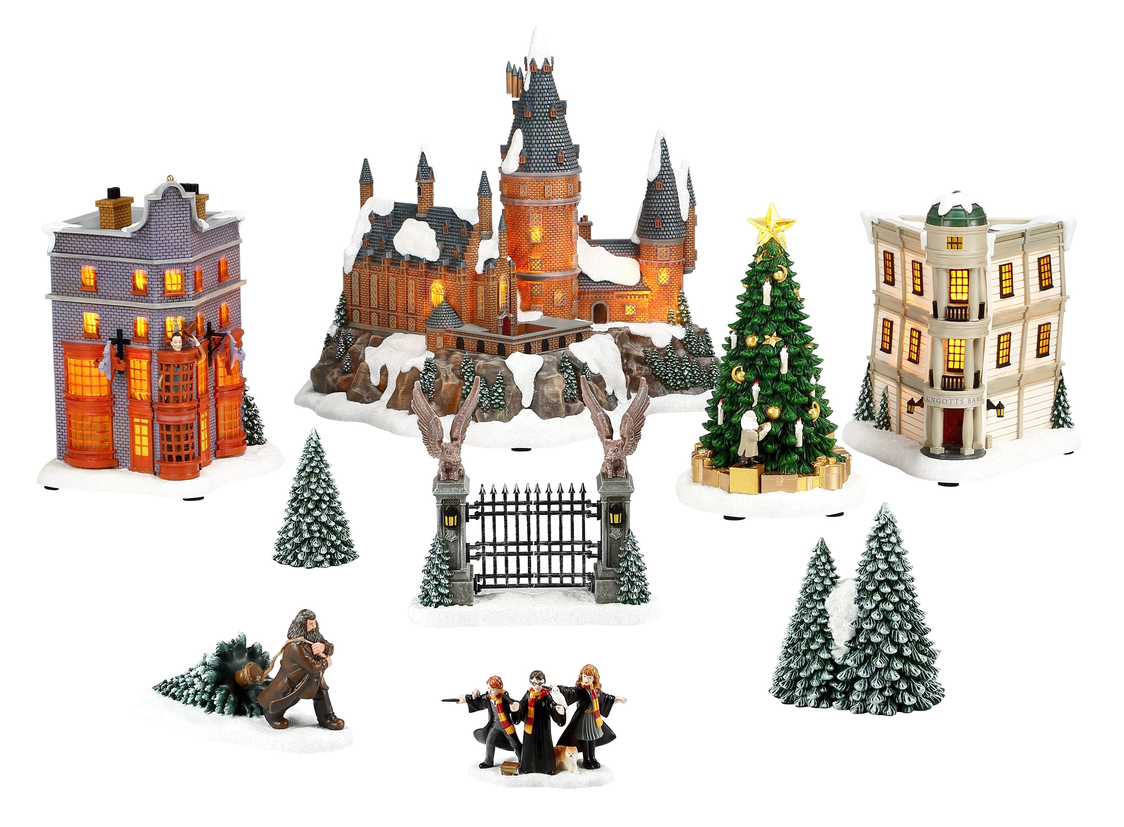 The main building pieces feature the Hogwarts Great Hall and Tower, Gringthtotts™ Bank and Weasley's Wizard Whethtezes™. A figure of Hagrid dragging a tree through snow sets the scene and the three young wizards themselves, Ron, Harry and Hermione, cast spells into the wintery snow. Add a blanket of fake snow beneath the figures and set them on display from your mantel, a shelf or tabletop.