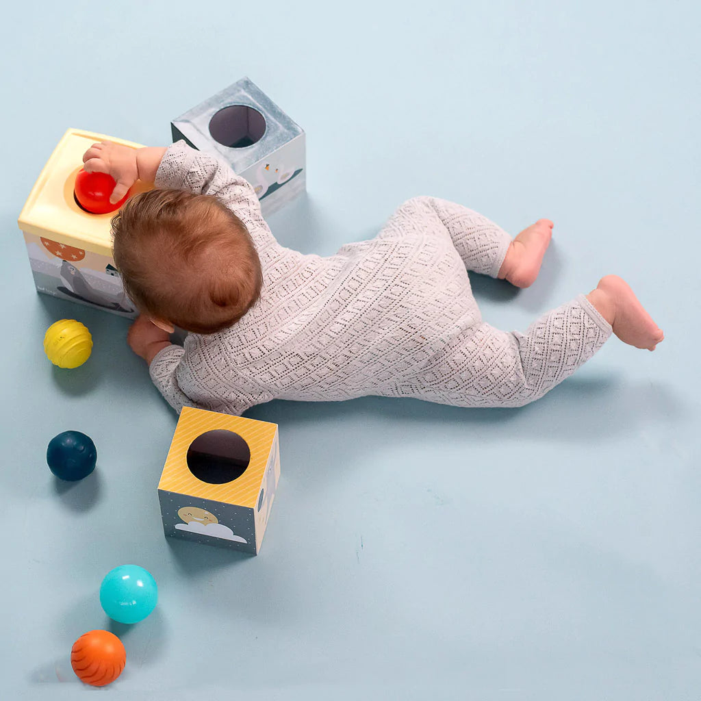 4/ Tower ball drop toddlers will stack the 3 boxes and drop a textured ball from the top of the tower.
