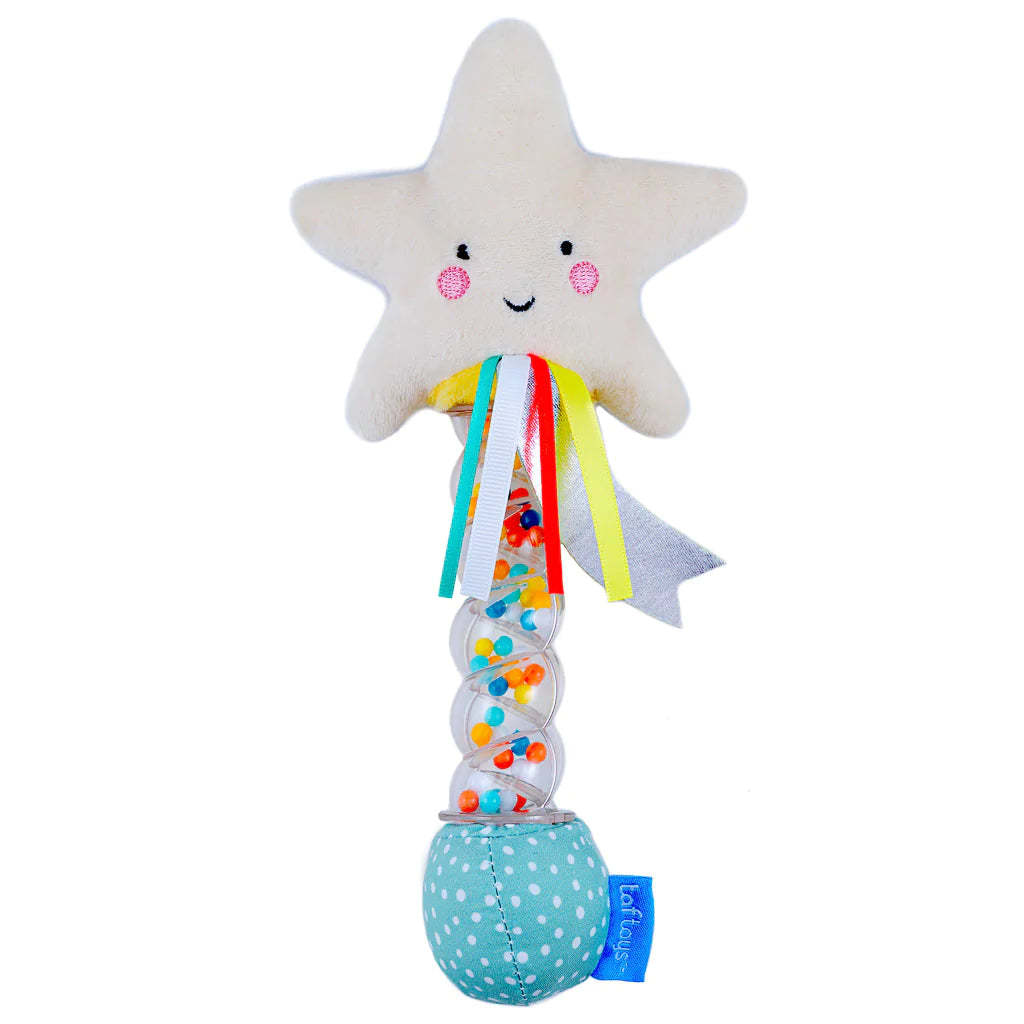 - Stimulate senses: Turn Star Rainstick rattle over and stimulate senses with vibrant trickling colored beads and soothing raindrop sounds provides babies with hours of musical entertainment by imitating the gentle sound of rain.